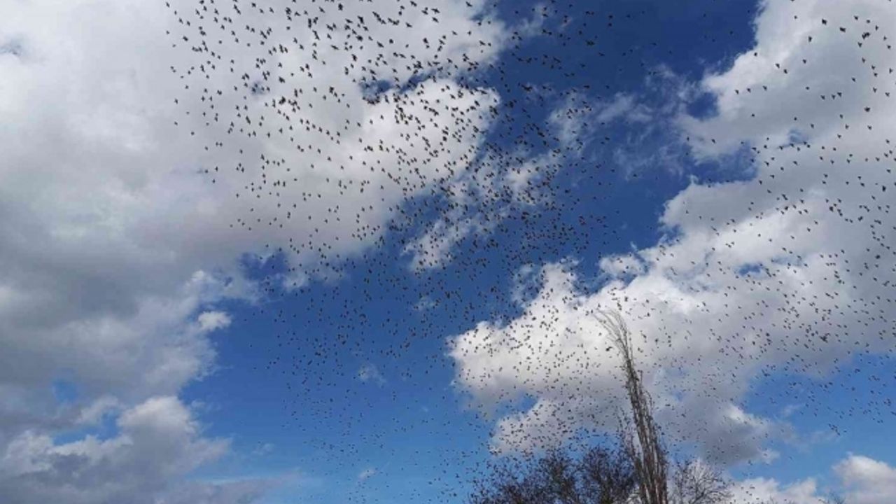 Manisa’nın Şehzadeler ilçesinde sığırcık kuşlarının gökyüzünde bulutlar altındaki dansı hayran bıraktı.