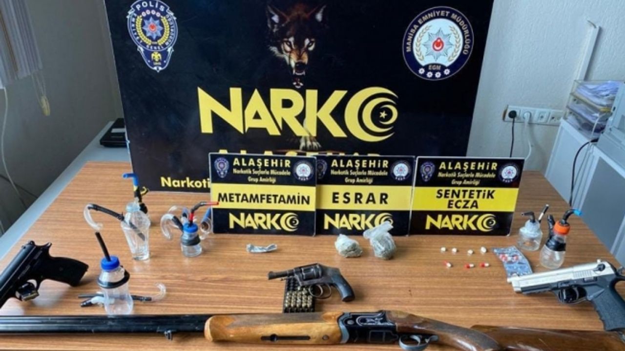 Manisa İl Emniyet Müdürlüğü Narkotik Suçlarla Mücadele Şube Müdürlüğü ve Alaşehir Narkotik Suçlarla Mücadele Grup Amirliği görevlilerince uyuşturucu veya uyarıcı madde ticareti yapan, nakleden ve kullanan şahıslara yönelik yapılan çalışmalarda Alaşehir ilçesinde 8 ikamet adresinde aramalar yapıldı. Yapılan aramalarda; 16,70 gram esrar maddesi, 2,13 gram metamfetamin maddesi, 6 adet sentetik ecza hapı, 3 adet extacy hap, 8 adet uyuşturucu madde kullanmaya yarayan aparat, 3 adet ruhsatsız tabanca, 1 adet ruhsatsız av tüfeği, 19 adet 9 mm fişek ve 3 adet 7.65 mm fişek ele geçirildi. Yapılan çalışma sonunda 9 şüpheli şahıs yakalanarak gözaltına alındı. Gözaltına alınan şüphelilerin emniyetteki işlemlerinin devam ettiği öğrenildi.