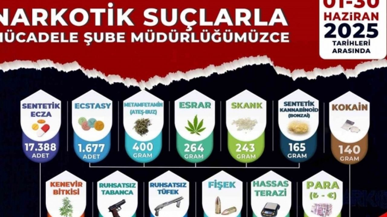 Manisa İl Emniyet Müdürlüğü, il genelinde uyuşturucu satıcılarına ve kullanıcılarına yönelik kapsamlı operasyonlarına devam ediyor. Haziran ayında Akhisar, Alaşehir, Salihli, Soma ve Turgutlu Narkotik Suçlarla Mücadele Büro Amirliklerinin de desteğiyle yürütülen çalışmalar kapsamında toplam 384 şüpheli yakalanırken, bunlardan 61’i tutuklandı. Aynı dönemde 97 aranan şahıs da yakalanarak adli mercilere teslim edildi. Haziran ayı boyunca gerçekleştirilen operasyonlarda; 17 bin 388 adet sentetik ecza (hap), bin 677 adet ecstasy hap, 264 gram esrar, 243 gram skunk, 140 gram kokain, 165 gram sentetik kannabinoid (bonzai), 400 gram metamfetamin, 102 kök hint keneviri, 2 adet ruhsatsız tabanca, 1 adet ruhsatsız av tüfeği, 113 adet fişek, 5 adet hassas terazi, 28 bin 670 TL uyuşturucu ticaretinden elde edildiği değerlendirilen nakit para ele geçirildi.