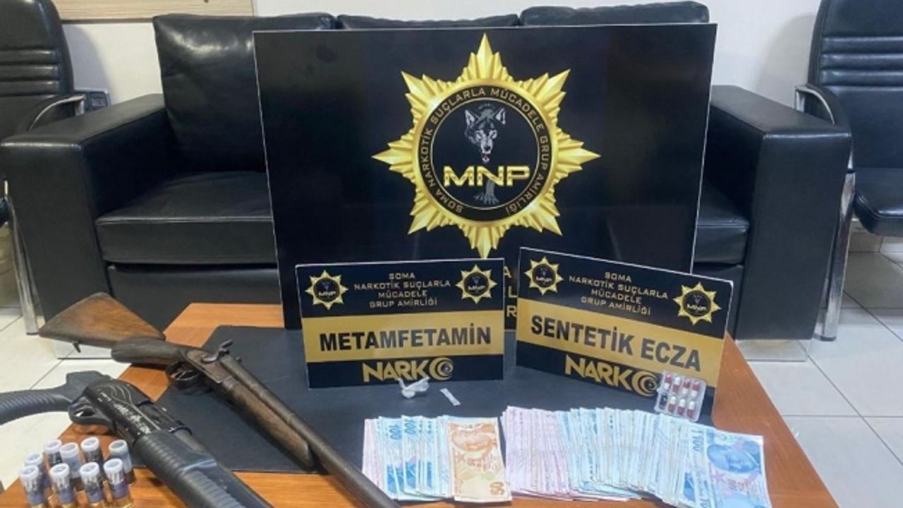 Manisa İl Emniyet Müdürlüğü Narkotik Suçlarla Mücadele Şube Müdürlüğü’ne bağlı Soma Narkotik Suçlarla Mücadele Grup Amirliği görevlilerince uyuşturucu veya uyarıcı madde ticareti yapan, nakleden ve kullanan şahıslara yönelik yürütülen çalışmalarda yapılan 7 ara yakalamada 12 parça halinde 10 gram metamfetamin, 25 gram esrar ele geçirilirken, 7 şüpheliye adli işlem yapıldı. Konuyla ilgili dosyanın sonlandırılması amacıyla Soma ilçesinde 3 şüpheli şahsa ait 4 ikamet ve 1 iş yerinde yapılan aramalarda ise iki parça halinde 2 gram metamfetamin maddesi, 7 adet sentetik ecza hapı, 2 adet uyuşturucu kullanmaya yarayan aparat, 2 adet tüfek, 9 adet fişek ve 17 bin 750 TL uyuşturucu madde ticaretinden elde edildiği değerlendirilen para ele geçirildi. Uyuşturucu veya uyarıcı madde imal ve ticareti yapmak suçundan gözaltına alınan İ.C. (47), T.K. (30) ve C.K. (31), sevk edildikleri adli makamlarca tutuklandı.