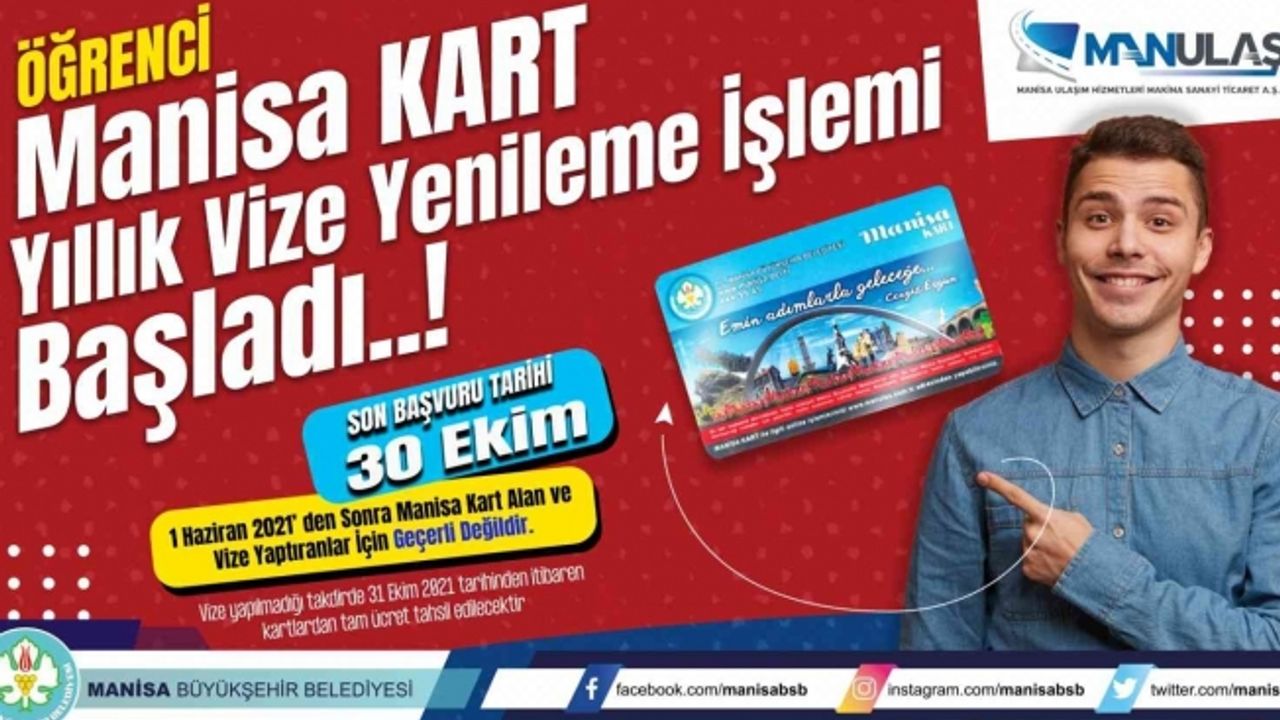 1 Haziran 2020-1 Haziran 2021 tarihleri arasında ve öncesinde Manisakart’ını alan ve toplu taşıma araçlarının indiriminden faydalanan öğrenciler için yıllık vize yenilemesi başladı. Manisa Büyükşehir Belediyesinden yapılan duyuruda, öğrencilerin toplu ulaşım araçlarından indirimli yararlanabilmesi için vize işlemini 30 Ekim tarihine kadar yaptırmaları gerektiği belirtildi.