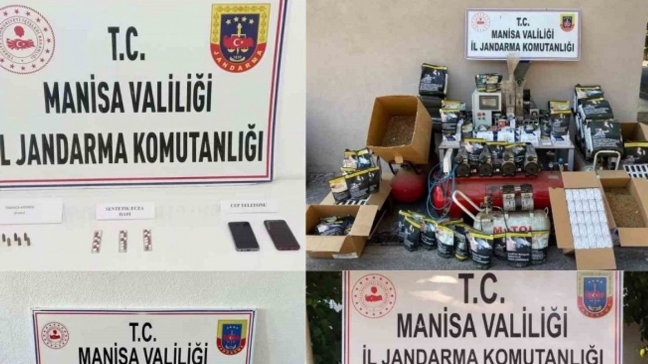 Manisa İl Jandarma Komutanlığı KOM Şube Müdürlüğü ile Alaşehir, Akhisar, Sarıgöl, Turgutlu, Kırkağaç ve Soma ilçe jandarma komutanlıkları tarafından, 09-14 Ağustos 2024 tarihleri arasında Uyuşturucu ve Kaçakçılıkla Mücadele kapsamında cumhuriyet savcılıklarının koordinesinde gerçekleştirilen narkotik operasyonlarında; 123 adet elektronik sigara, 146 bin 452 adet dolu ve boş makaron, 339 kilogram kaçak tütün, 3 bin 500 adet klipsli poşet, 4 adet sanayi tipi sigara sarmada kullanılan kompresör makinesi, 1 adet otomatik sigara sarma makinesi, 1250 adet kesilmiş makaron bandrolü, 41 paket kaçak sigara, 6 adet sentetik uyuşturucu hap, 2 gram esrar, 23 adet kenevir, 1 adet ruhsatsız av tüfeği, 4 adet uyuşturucu içme aparatı ele geçirildi. Olaylara karışan 9 şahıs hakkında ise adli işlemlere başlandığı açıklandı.