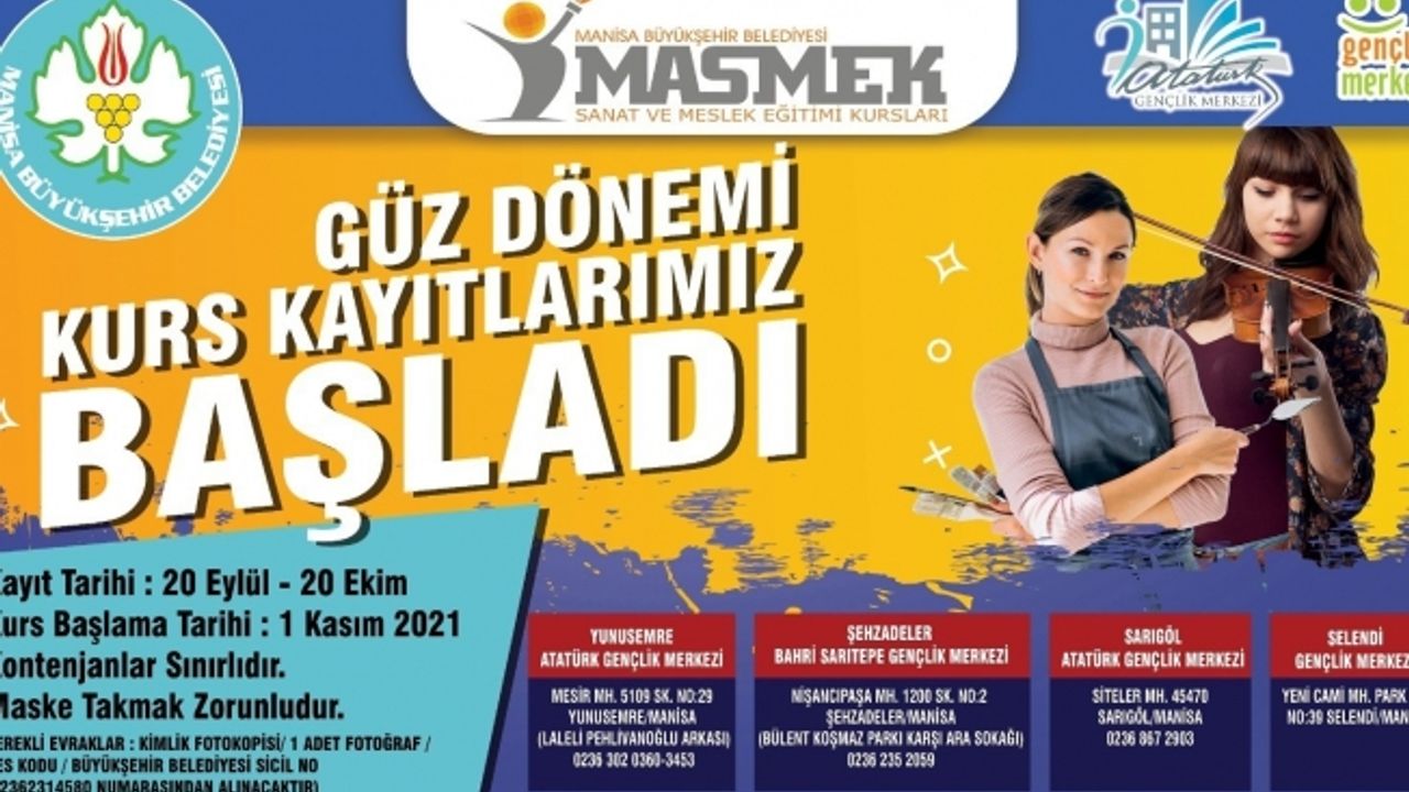 Manisa Büyükşehir Belediye Başkanı Cengiz Ergün öncülüğünde her yaştan vatandaşın kendilerini istedikleri alanda geliştirebilmeleri amacıyla hayata geçirilen Manisa Büyükşehir Belediyesi Sanat ve Meslek Edindirme Kursları’nda (MASMEK), güz dönemi kurs kayıtları alınmaya başlandı. Yunusemre Atatürk Gençlik Merkezi, Şehzadeler Bahri Sarıtepe Gençlik Merkezi, Sarıgöl Atatürk Gençlik Merkezi ve Selendi Gençlik Merkezi’nde verilecek kurslara son başvurunun 20 Ekim olduğu belirtilirken, Covid-19 tedbirleri kapsamında maske takmanın zorunlu olduğu da vurgulandı.
