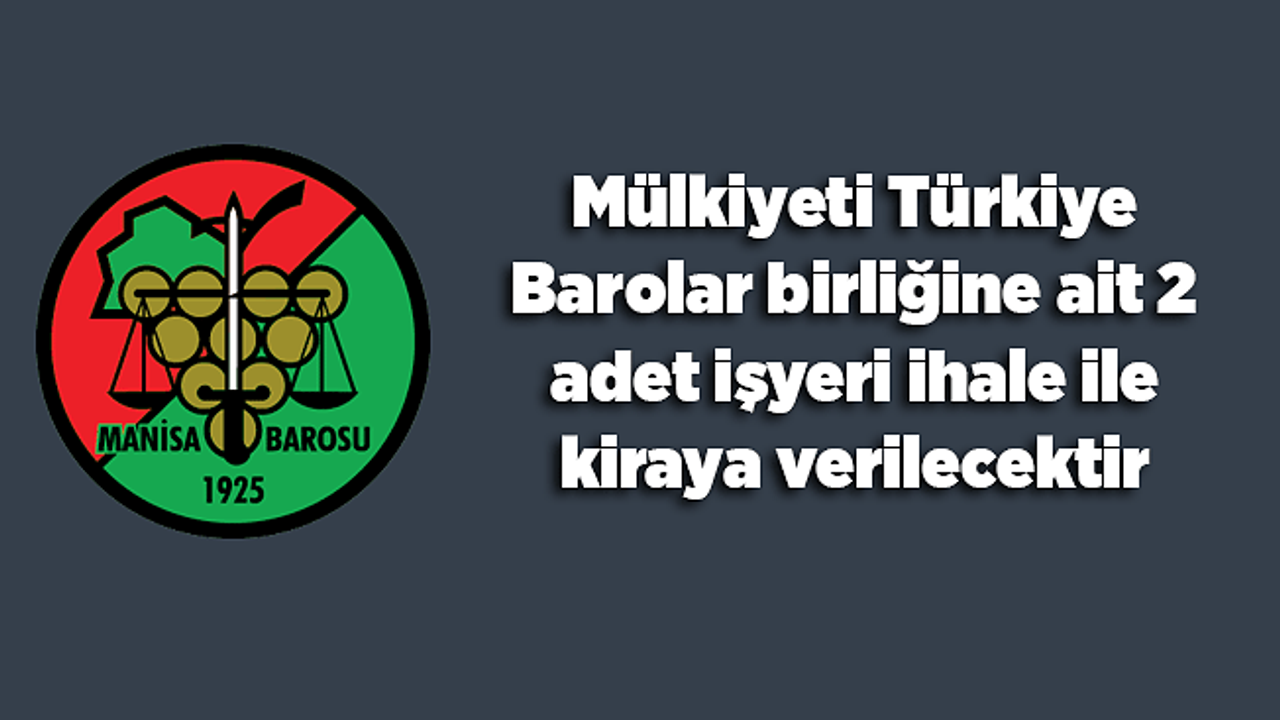 Mülkiyeti Türkiye Barolar Birliği’ ne ait, 75.Yıl Mah.5345 Sok. No:54 Yunusemre /Manisa adresinde bulunan Manisa Barosu hizmet binasının Zemin Kat 2 nolu ve 3 nolu iki adet dükkanı mevcut haliyle ve kapalı zarf içerisinde 27/03/2023 tarihine kadar teklif verme usulüyle kiraya verilecektir. Şartname Manisa Barosu Hizmet Binası 2. Kat adresinden temin edilebilir.