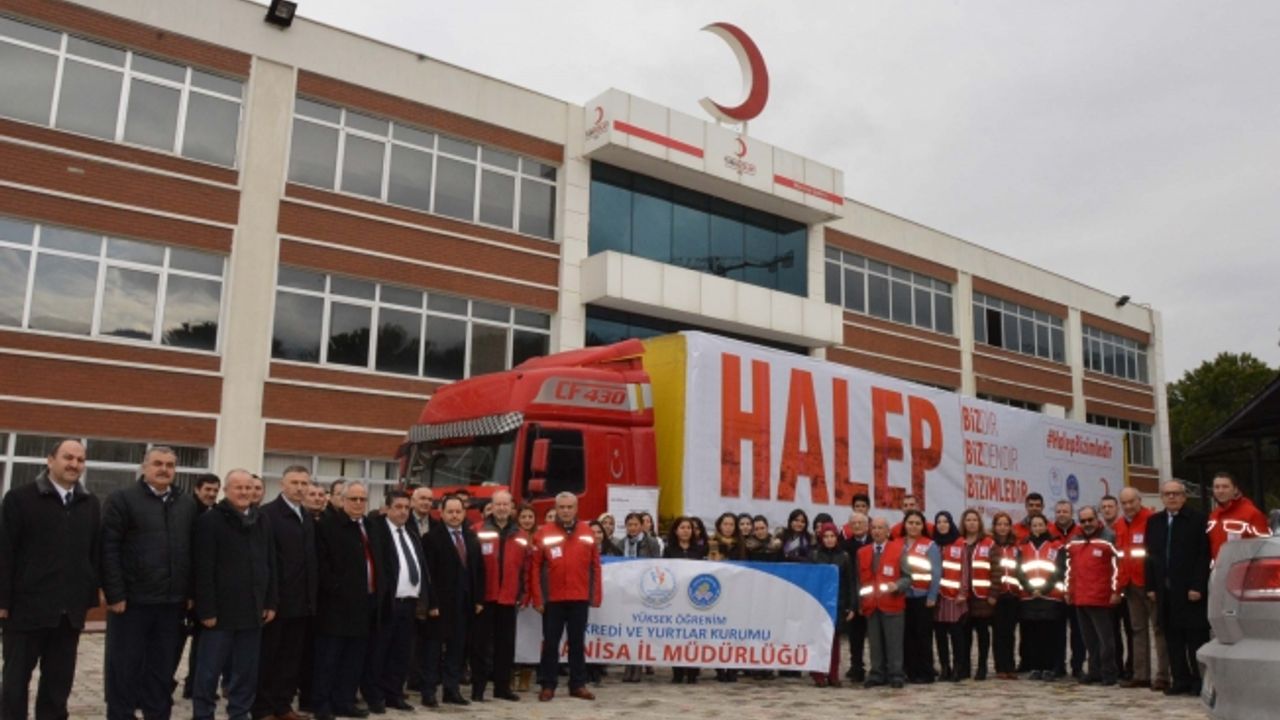 Türk Kızılayı Manisa Şubesi’nde düzenlenen uğurlama törenine Türk Kızılayı Genel Merkezi Yönetim Kurulu Üyesi Cengiz Yurdabekçi, Türk Kızılayı Manisa Şube Başkanı Cemal Kahraman, Kredi Yurtlar Kurumu İl Müdürü Kemal Koçkaya, yurtlarda kalan üniversiteli öğrenciler ve Kızılay gönüllüleri katıldı.Türk Kızılayı Manisa Şube Başkanı Cemal Kahraman, “Kredi ve Yurtlar Kurumunun hazırladığı yardım malzemeleri arasında 795 paket gıda malzemesi, giyecek paketi 197 adet, mutfak paketi 29 adet, temizlik paketi 77 adet, 150 adet de battaniye bulunmaktadır. Manisa şubesi olarak da biz TIR’ımızı kendi bütçemizle hazırladık ve Halep’e Kızılaycılara göndereceğiz” dedi.