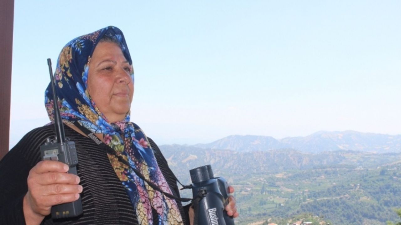 Orman İşletme Müdürlüğü Allahdiyen Yangın Gözetleme Kulesinde 38 yıldır çalışan Nurten Güler, 110 bin hektarlık ormanlık alanı bir elinde dürbün, diğerinde telsiz ile 24 saat gözetim altında tutuyor.