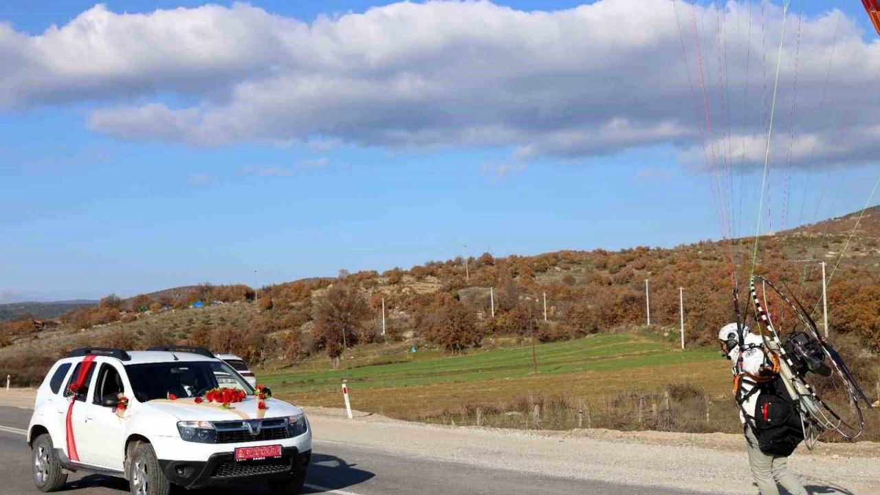 Damat Erdoğan Çiyrak ile gelin Rahmet Çiyrak, arkadaşlarının bu farklı sürprizi karşısında mutluluklarını gizleyemedi. Paramotorcular, gelin arabasının önünü açmak için geleneksel düğün şakalarına havadan farklı bir yorum katarak sembolik bahşiş istedi. Renkli anlar kameralara yansırken, bahşişin verilmesinin ardından ekip yeniden havalanarak konvoyun yolunu açtı.