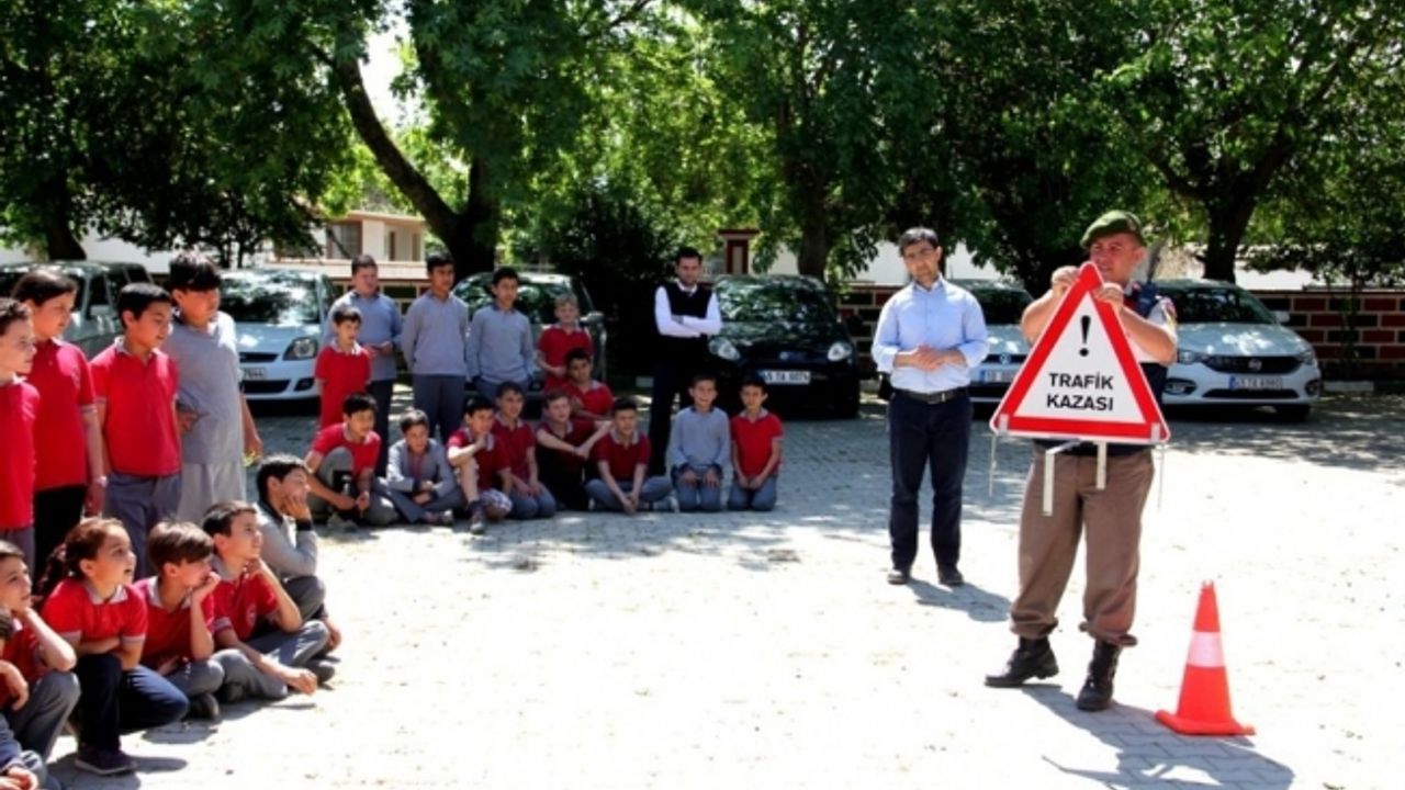 Alaşehir İlçe Jandarma Komutanlığına bağlı jandarma trafik ekipleri, görev sahası kapsamında yer alan Sarıgöl’ün Tırazlar Mahallesindeki Hüseyin Gümüşlü İlkokulu ve Ortaokulu’nda öğrencilere uygulamalı trafik eğitimi verdi. İlkokul 1, 2 ve 3. sınıf öğrencilerine trafik konulu çizgi filim ve sinevizyon gösterimi eşliğinde trafik kuralları anlatılırken, ortaokul öğrencilerine ise bahçede uygulamalı trafik dersi verildi. Jandarma ekipleri daha sonra kahvehane ve iş yerlerine trafik konulu afişler astı. Ekipler, Sarıgöl Ziraat Odası Başkanlığı desteği ile temin edilen 75 adet reflektörün dağıtımını da gerçekleştirdi. Çimentepe Mahallesinde uygulama yapan ekipler, traktör ve motosiklet kullanan çiftçilere reflektörleri teslim etti. Sarıgöl Ziraat Odası Başkanı Ali İhsan Ülgen, "Yaz aylarında traktörler yollara çok çıkmakta özellikle gece daha belirgin görülmesi için reflektör takılmasında yarar var. Biz de öncülüğünü yaptık. Bizlere yardımcı olan jandarma ekiplerimize de teşekkür ederiz’’ dedi.