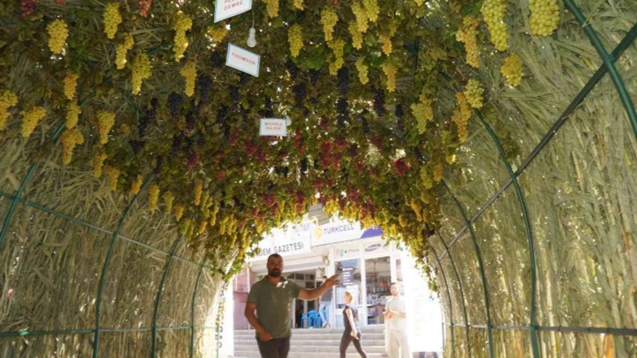 Manisa’nın Sarıgöl ilçesinde 14.Geleneksel Sultaniye Üzüm Festivali çerçevesinde kurulan üzüm tüneli vatandaşların ilgi odağı oldu.