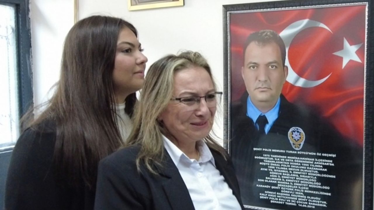 Manisa’da şehit polis Turan Sütçü’nün adı düzenlenen törenle, büyük kızının mezun olduğu, küçük kızının da 3. sınıfta okuduğu Laleli İlkokuluna verildi. Törene katılan şehidin eşi İlknur Sütçü duygu dolu anlar yaşadı.