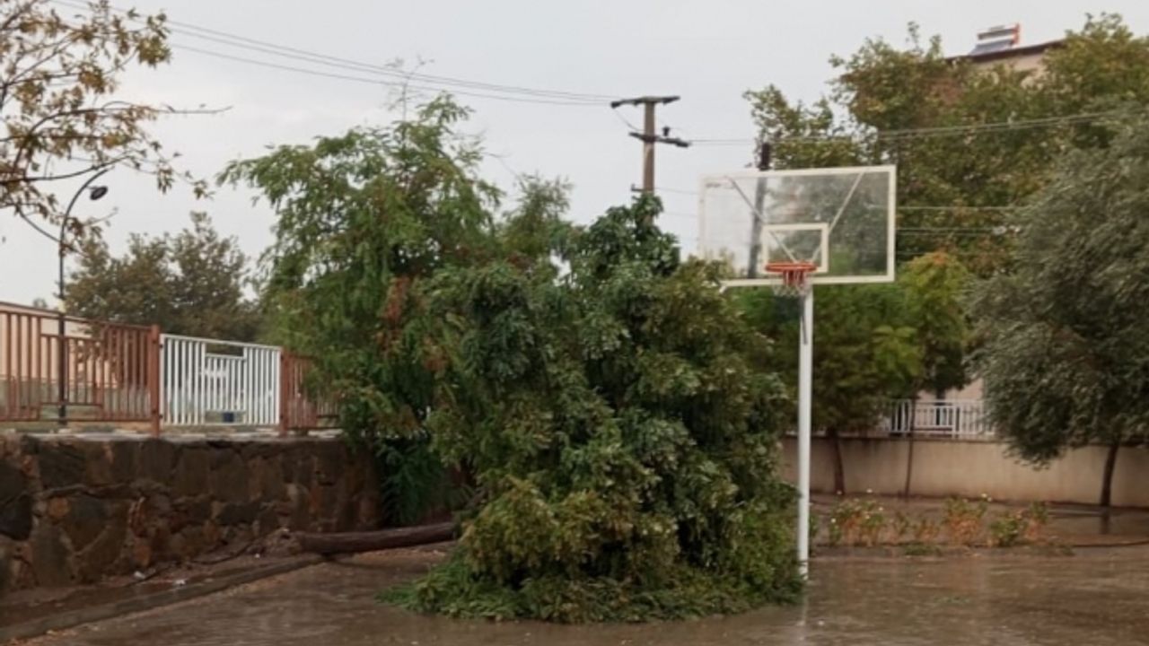 Manisa’nın Sarıgöl ilçesinde etkili olan şiddetli sağanak yağış ve rüzgar Sarıgöl Mustafa Metin İmam Hatip Ortaokulu bahçesindeki bir ağacın kökünden devrilmesine neden oldu.