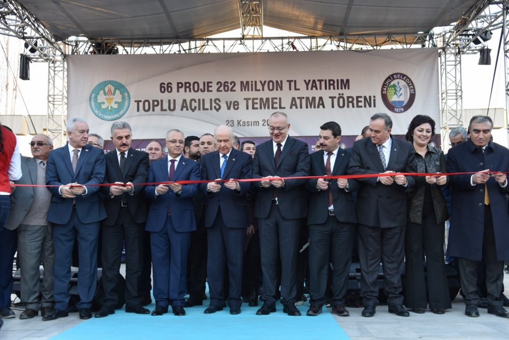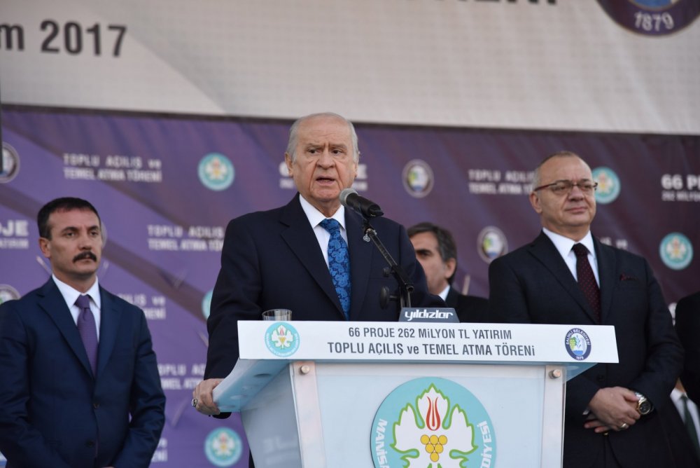 Son olarak MHP Genel Başkanı Devlet Bahçeli kürsüye davet edildi. 4 Ekim tarihinde Manisa Büyükşehir Belediyesinin Uzunburun Katı Atık Bertaraf ve Düzenli Depolama Tesisi açılışı için daha önce Manisa’ya geldiğini hatırlatan Genel Başkan Devlet Bahçeli, “Manisa Büyükşehir ve ilçe belediyelerimizin kısa bir sürede hayata geçirdiği açılış ve temel atma törenleri vesilesiyle bir kez daha sizlerle bir araya gelmekten son derece bahtiyarım. 72 milyon lira yatırım bedeline sahip tam 48 projenin Selendi’ye kazandırılacak olmasından gururluyum, sizlerle iftihar ediyorum. Selendi Kent Meydanı’nı dolduran siz değerli vatandaşlarıma ve bu törenin gerçeklemesinde emeği geçen başta Manisa Büyükşehir Belediye Başkanımız Cengiz Ergün ve Selendi Belediye Başkanımız Nurullah Savaş Bey başta olmak üzere tüm teşkilat yöneticilerimize ve dava arkadaşlarımıza şükranlarımı sunuyorum. Dört ilçemizde, 803 milyon liralık yatırım tutarıyla açılış ve temel atma törenini gerçekleştireceğimiz toplamda 248 projenin Manisa’ya, Manisalı kardeşlerime hayırlı uğurlu olmasını yürekten temenni ediyorum” dedi.