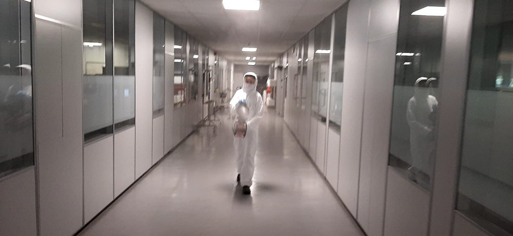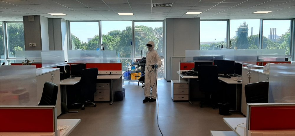 • Tüm tesiste ofis, ortak alanlar, yemekhane ve mutfak alanlarında kapsamlı temizlik ve sonrasında dezenfekte çalışmaları başlattık ve belli periyodlar halinde dezenfekte ediyoruz. Hijyen gerektiren bütün ekipmanlar (bardak, çatal kaşık vs) özel dezenfektanlarla yıkanıyor.