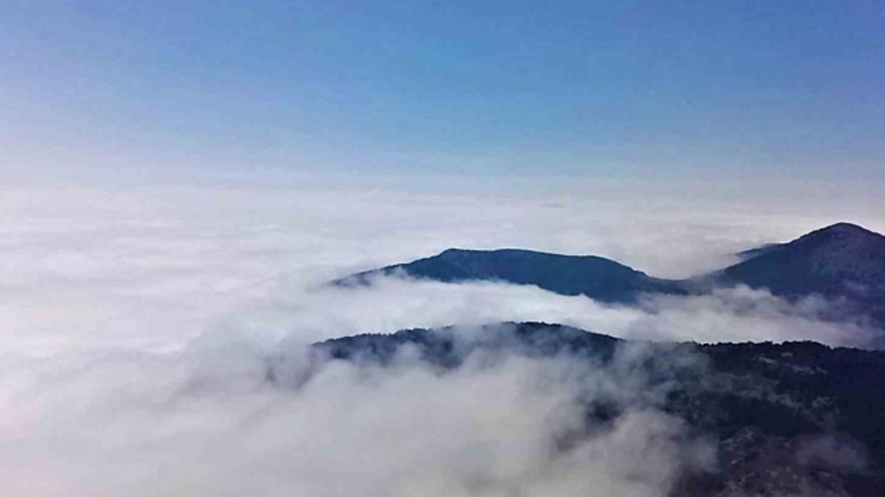 Manisa’nın eteklerine kurulduğu bin 517 metre yüksekliğindeki Spil Dağı Milli Parkı zirveye kadar bulutlarla kaplandı. Bulutların üstünde kalan zirvenin etrafını kaplayan bulutlar görsel şölen oluşturdu.