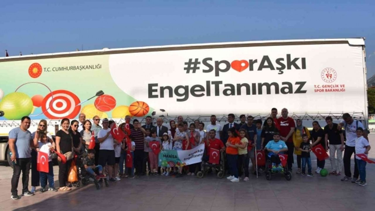Cumhurbaşkanlığı, Gençlik ve Spor Bakanlığı ile Milli Eğitim Bakanlığının ortak projesi "Spor Aşkı Engel Tanımaz" çerçevesinde özel eğitim okullarına, farklı engel gruplarının kullanımına sunmak üzere üretilmiş spor malzemeleri taşıyan tır Manisa’ya geldi.