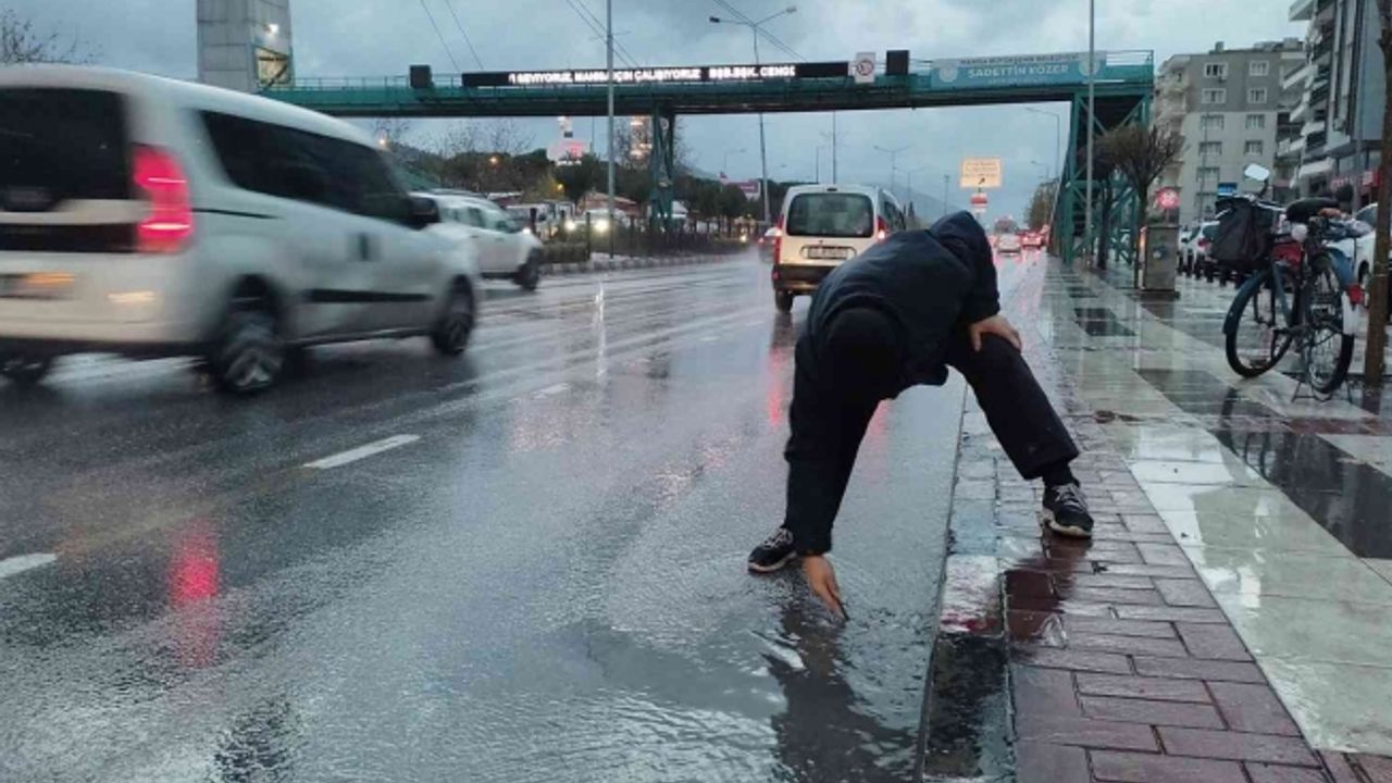 Manisa’da kent genelinde etkili olan şiddetli yağış bazı cadde ve sokaklarda yağmur suyu mazgallarının tıkanmasına ve su birikintilerine neden oldu. Geçimini çöplerden topladığı geri dönüşüm malzemeleri ile sağlayan Rıza Altıner isimli vatandaş duruma duyarsız kalmayarak mazgallarda biriken çöp ve yaprakları elleriyle temizleyerek yağmur sularının sorunsuz bir şekilde akıp gitmesini sağladı.