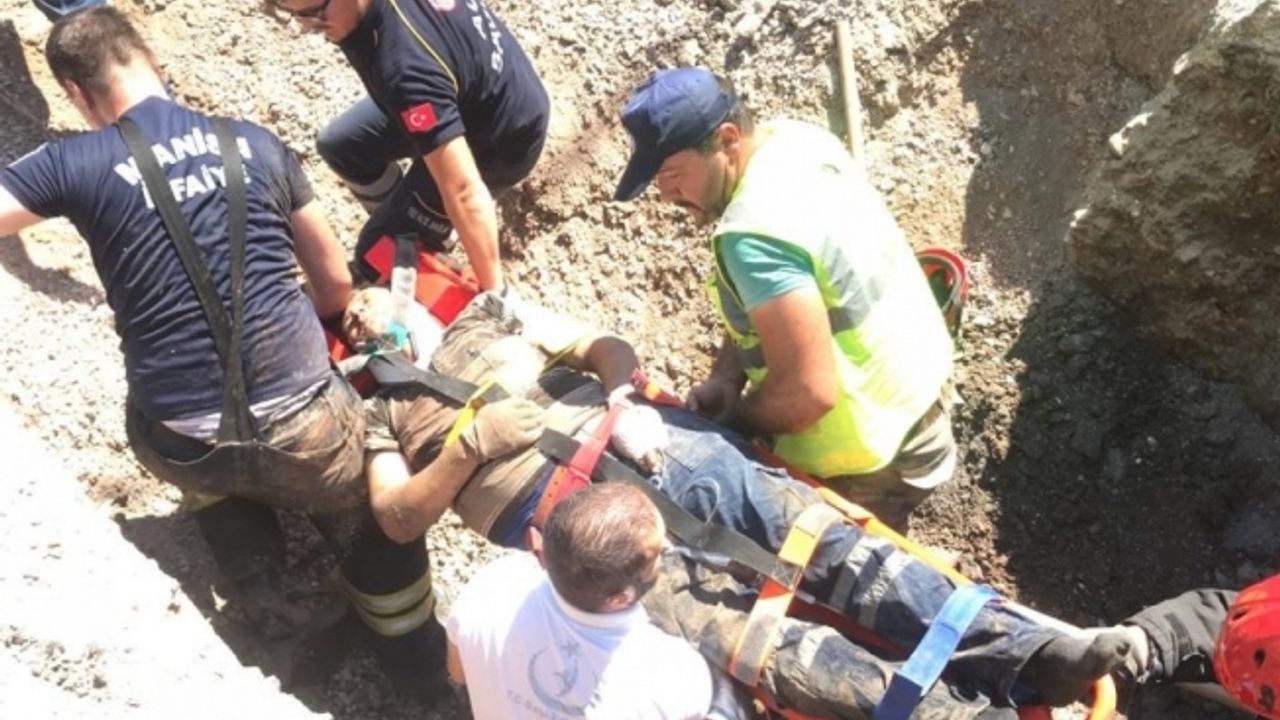 Manisa’nın Akhisar ilçesinde yağmur suyu hattı çalışması yapıldığı sırada yolda meydana gelen göçükte bir işçi toprak altında kaldı. Boynuna kadar toprağa gömülen işçinin yardımına koşan mesai arkadaşları elleriyle toprağı kazarken, itfaiye ekipleri tarafından göçükten çıkarılan yaralı işçi hastanede tedavi altına alındı.