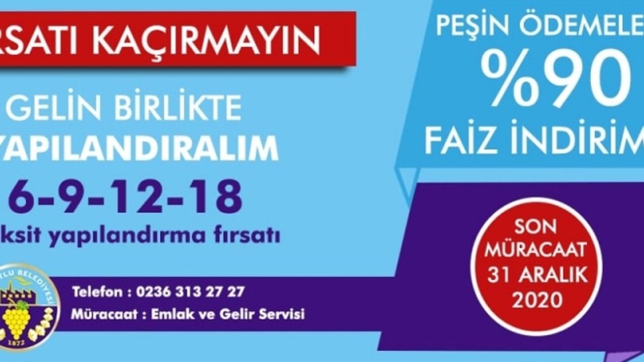 Resmi Gazete’de yayımlanan ‘Bazı Alacakların Yeniden Yapılandırılması ile Bazı Kanunlarda Değişiklik Yapılması Hakkındaki Kanun’una göre Emlak ve Çevre Temizlik Vergi borçları da yapılandırma kapsamına alındı. Turgutlu Belediyesi de sunduğu hizmetle vergi borçlarını yapılandırıyor. Vergi borçlarını yapılandırmak isteyen Turgutlulular, peşin ödemelerde yüzde 90 faiz indiriminin yanı sıra 6, 9, 12 ve 18 taksitte yapılandırma fırsatından yararlanabilecek.