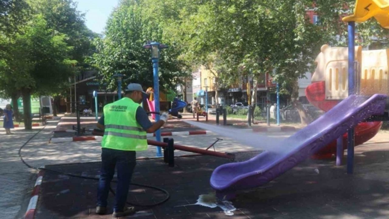 Turgutlu Belediyesi Temizlik İşleri Müdürlüğü gerçekleştirdiği dezenfekte çalışmalarıyla parkları ve çocuk oyun gruplarını temiz ve hijyenik hale getiriyor.