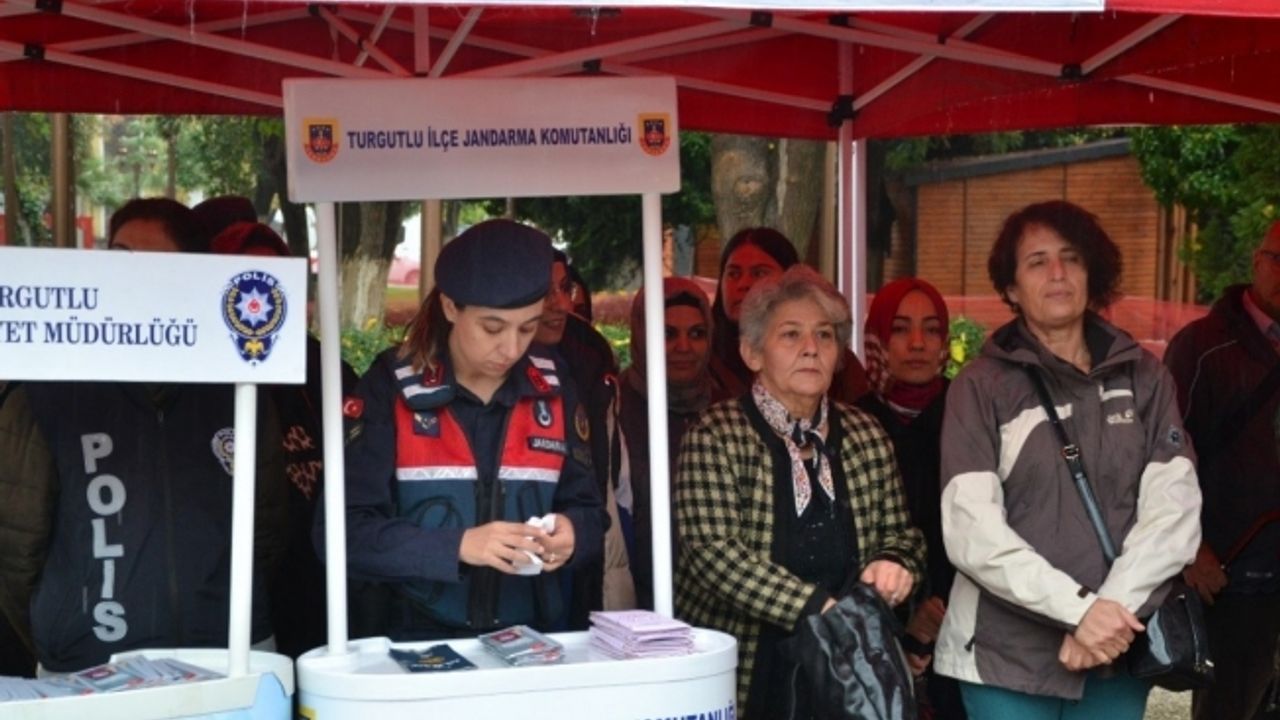 Manisa’nın Turgutlu ilçesinde 25 Kasım Kadına Yönelik Şiddete Karşı Uluslararası Mücadele Günü etkinliklerinde Orta Park’ta bulunan saat kulesi önünde, Turgutlu Kaymakamlığı Sosyal Hizmet Merkezi Müdürlüğü, Turgutlu Belediyesi, İlçe Jandarma Komutanlığı ve İlçe Emniyet Müdürlüğü işbirliğiyle açılan stantda broşür dağıtılarak vatandaşlar bilgilendirildi.
