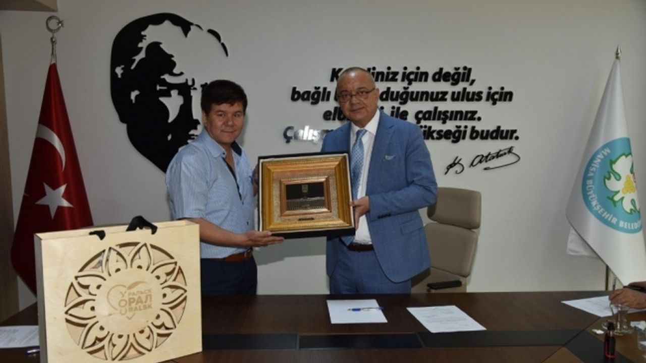 Manisa Büyükşehir Belediye Meclisi üyeleri Manisa Büyükşehir Belediyesi’nin kardeş şehri Kazakistan’ın Ural Belediye Başkanı Mukayev Murat Rahmetuly’nun hediyelerini ve selamlarını Manisa Büyükşehir Belediye Başkanı Cengiz Ergün’e iletti.