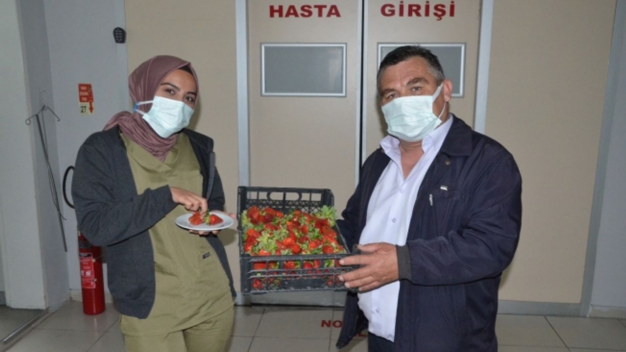 Manisa’nın Kırkağaç ilçesinde çilek üreticiliği yapan Mehmet Eğrioğlu, özenle yetiştirdiği çileklerin ilk mahsulünü korona virüs salgınıyla mücadele eden sağlıkçılara ikram ederek örnek bir davranış sergiledi.