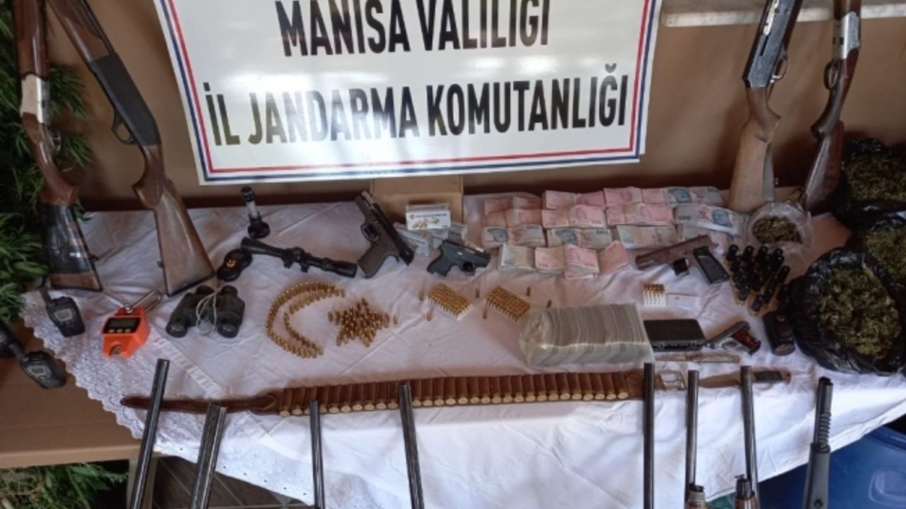 Manisa’nın Yunusemre ilçesinde Jandarma tarafından gerçekleştirilen şafak operasyonda çok sayıda uyuşturucu madde ele geçirilirken olayla ilgili 5 kişi de gözaltına alındı. Jandarma Komando timinin de destek verdiği operasyonda 22 bin 345 kök Hint Keneviri, 65 kilogram kubar esrar, 12 av tüfeği, 1 ruhsatsız tabanca, 170 bin TL nakit para ve çok sayıda ekipman ele geçirildi.