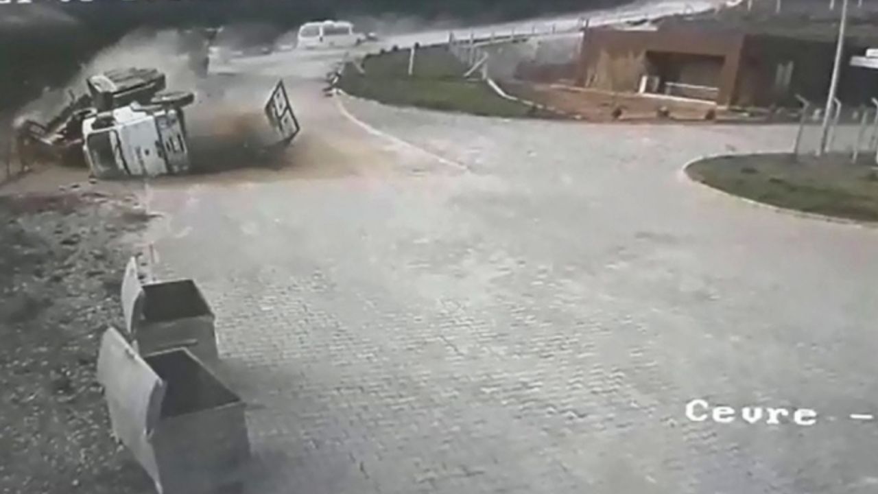 Manisa’nın Alaşehir ilçesinde bu sabah saatlerinde meydana gelen vinç kazası güvenlik kamerasına yansıdı. Sürücünün hayatını kaybettiği kazada vincin hızını alamayarak önce demir kapıyı kırdığı ardından da devrilme anları kameralara yansıdı.