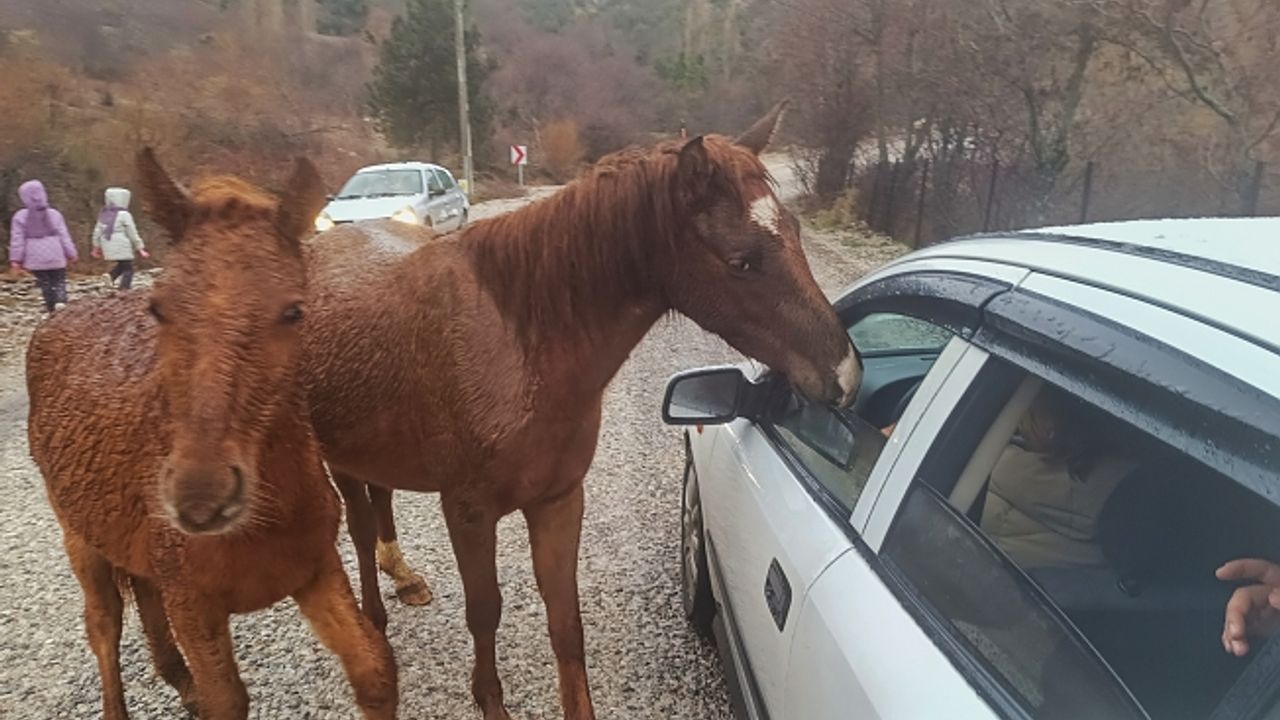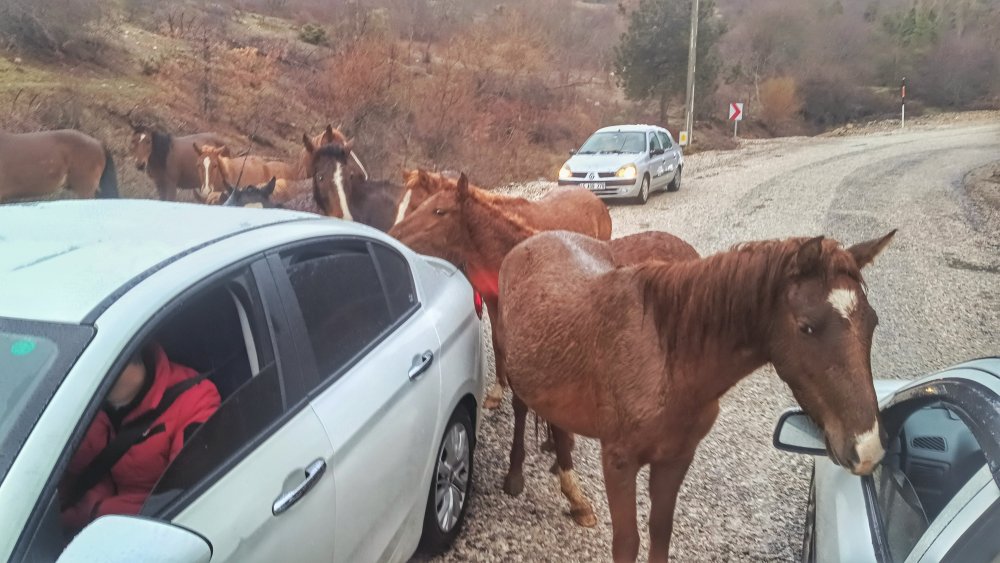 Bazı vatandaşlar bu duruma "Yılkı atları Milli Park sahasına giren ziyaretçileri karşılıyor ve adeta giriş ücreti alır gibi yiyecek için araçların içine kadar kafalarını sokuyorlar." diyerek tebessüm ediyorlar. (Turgay Duyar)